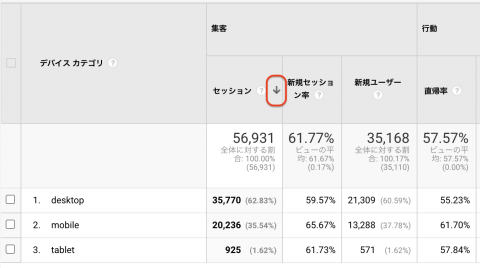 今回のデバイスレポートでは、下図のように項目名の横に上向き(昇順)もしくは下向き(降順)のマークがついている項目を基準に、並べ替えがされています。修了レポートでは「セッションの多い順」など、並び順も指定していますので、あらかじめGoogle アナリティクスの画面上で並び順を整えてから、エクスポートするようにしましょう。