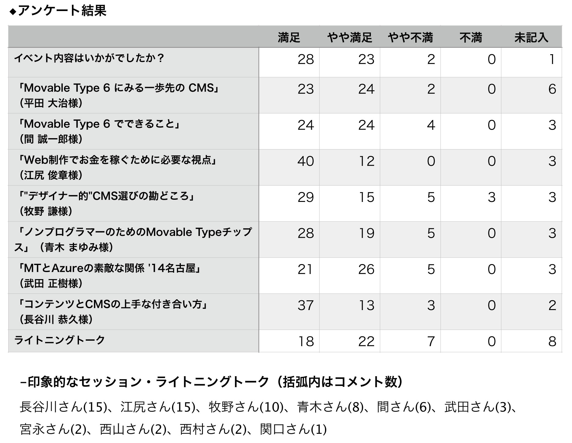 アンケート結果も高評価をいただき、誠にありがとうございました。