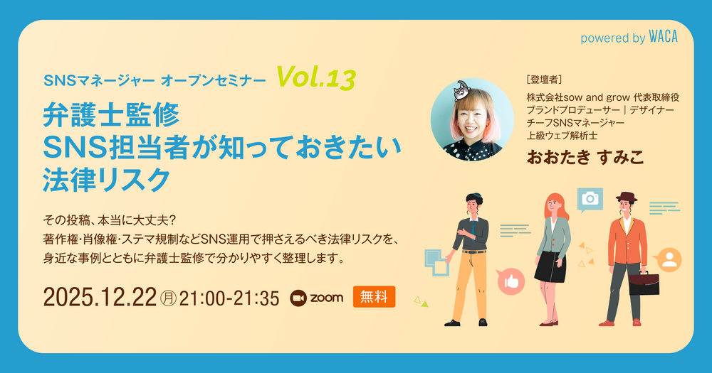 その投稿、本当に大丈夫? 著作権・肖像権・ステマ規制などにアンテナを立てておこう(12/22 無料オンライ... 2025年12月22日(月)21:00~21:35弁護士監修SNS担当者が知っておきたい法律リスク【SNSマネージャーオープンセミナーVol.13】一般社団法人ウェブ解析士協会(WACA)は12...