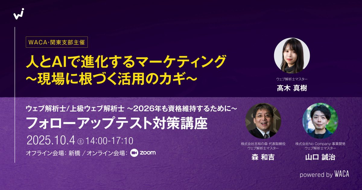 最新のAI活用によるウェブサイト分析と改善手法の体系的な習得、および2026年度ウェブ解析士・上級ウェブ解析士フォローアップテスト合格のための網羅的サポートを目的とする。