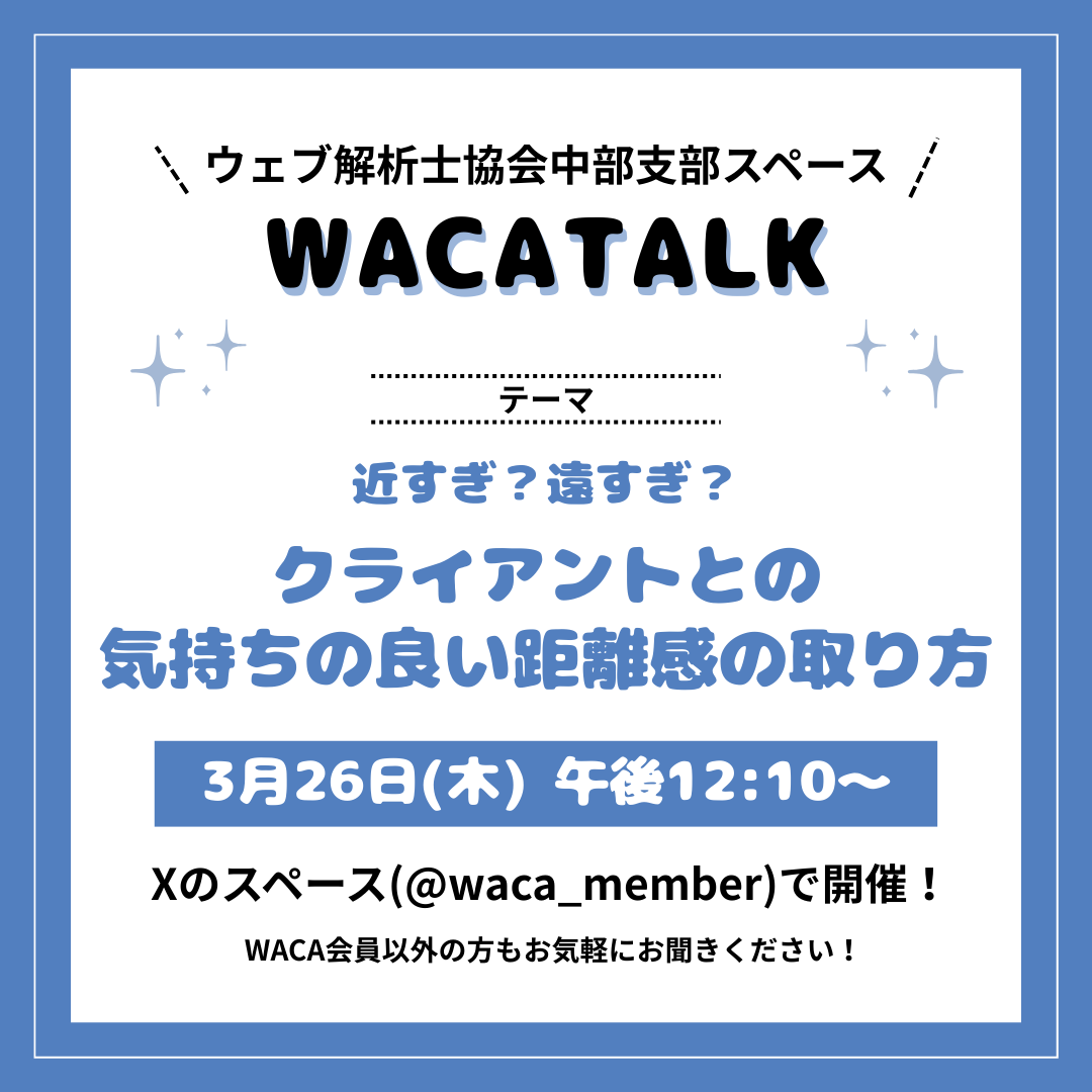 2026年3月26日(木)の12時10分より、WACA中部支部にてXスペースを開催しました。今回のテーマは「クライアントとの気持ちの良い距離感の取り方」です。フリーランスや支援者それぞれの立場から、実体験をもとに関係構築の工夫について共有され、約7名の参加者とともに実践的な学びの場となりました。