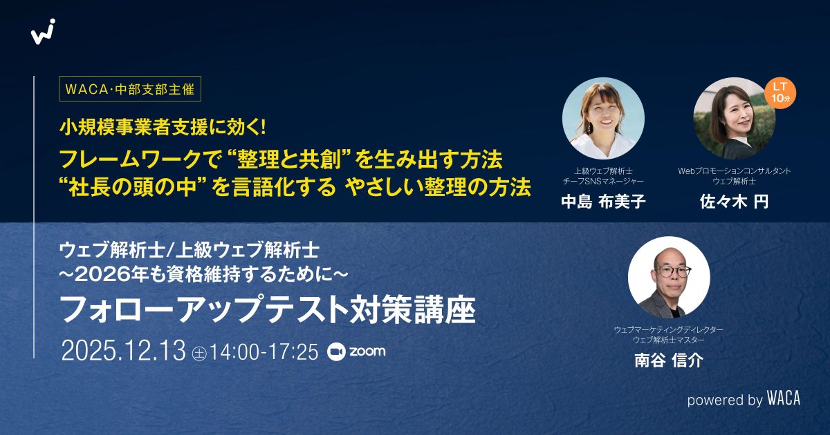 【WACA中部支部主催】小規模事業者支援に効く!フレームワークで“整理と共創”を生み出す方法 ——“社長の頭の中”を言語化する やさしい整理の方法——&フォローアップテスト対策講座<ウェブ解析士・上級ウェブ解析士>〜2026年も資格維持するために〜